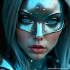 View PromptClose-up portrait of a futuristic female character with a face resembling metallic chrome, adorned with fine droplets for a glossy, surreal texture. Her vivid deep teal eyes contrast sharply against her silver skin, and her metallic makeup emphasizes her high-tech, futuristic style. Cold blue light reflects on parts of her face, adding a hint of cold to her cool silver tones. Her hair flows around her like liquid metal, smoothly framing her face. The background is dark. |